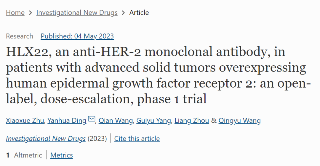 ¸´ºêººÁØÁ¢ÒìÐÍ¿¹HER2µ¥¿¹HLX22 IÆÚÑо¿Ð§¹û½ÒÏþÓÚInvestigational New Drugs