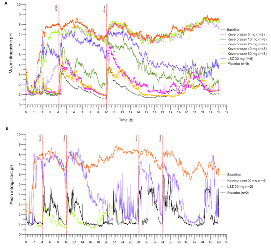 ͼ1. ·þÓÃ5mg-60mg ÑÎËá¿ÆÕÀÉú¡¢30mg À¼Ë÷Àßò»òο½å¼Áºó£¬£¬£¬£¬£¬£¬£¨A£©24hÄÚÆ½¾ùθÄÚpH -ʱ¼äÇúÏߣ¬£¬£¬£¬£¬£¬£¨B£©48hÄÚÆ½¾ùθÄÚpH -ʱ¼äÇúÏß