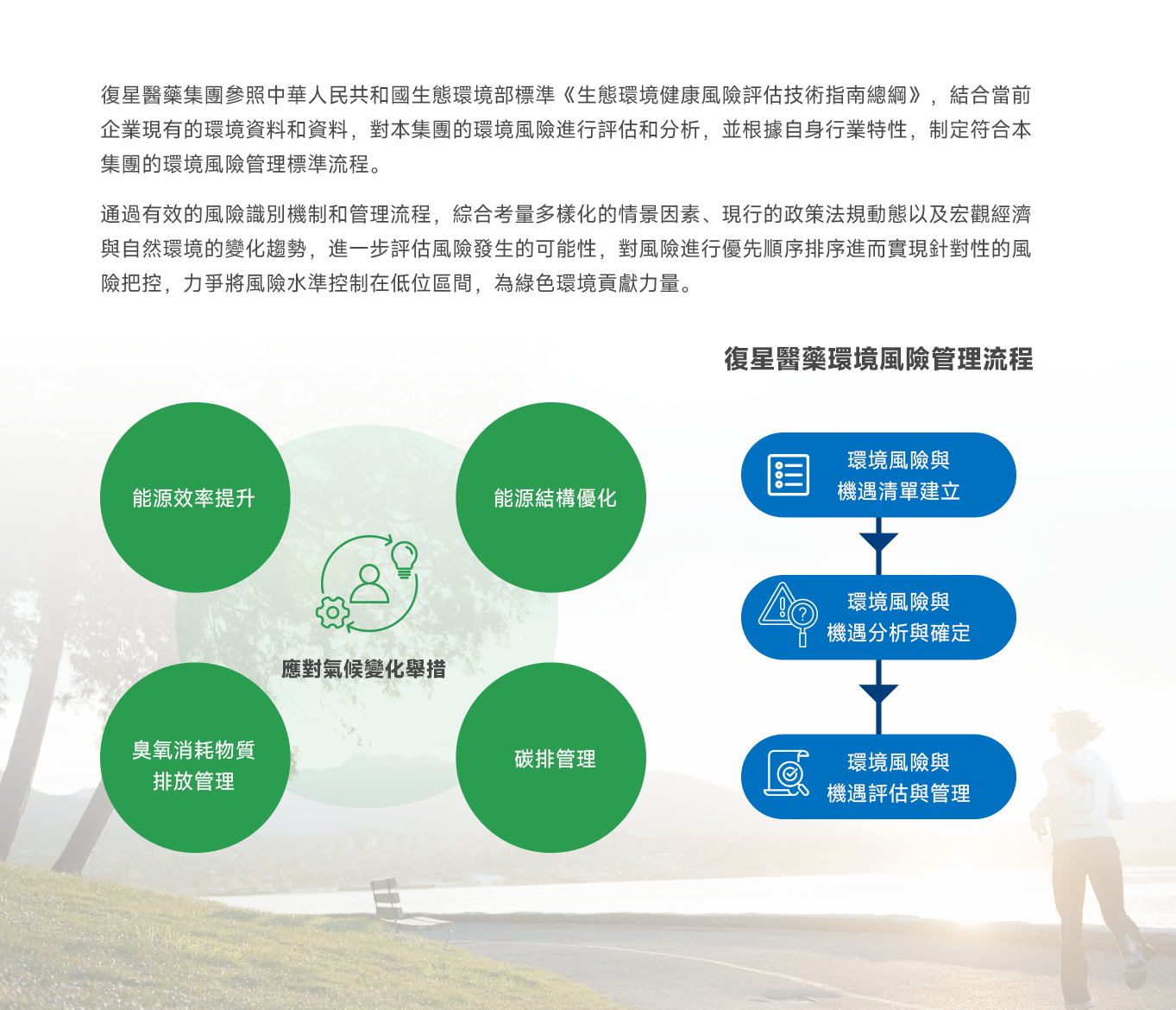 復星醫藥董事會為“應對氣候變化”和“環境治理”議題的最高責任機構,,,,,由ESG治理體系周全負責議題的監督、決策、治理和執行。。。。。。。。同時,,,,,本集團已將“應對氣候變化”和“環境治理”相關目標與指標納入高級治理層績效审核書中。。。。。。。。